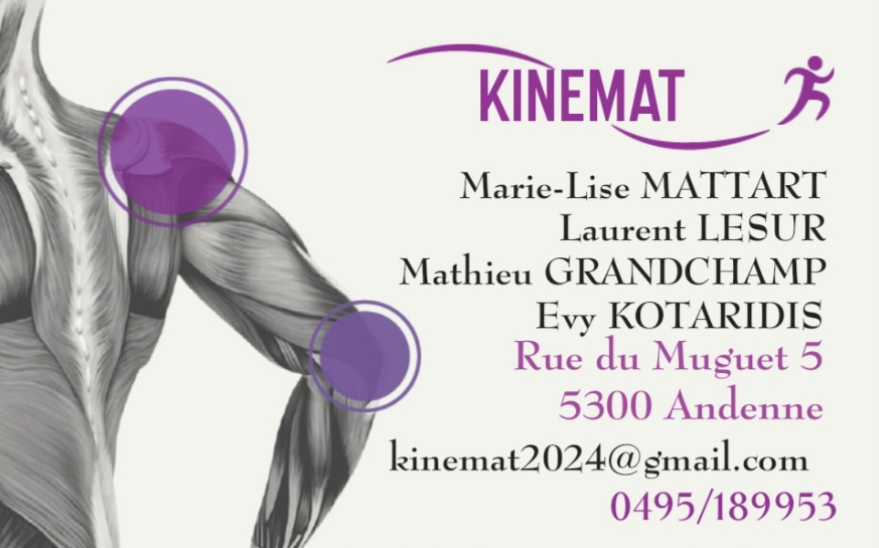 Au sein du cabinet KINEMAT, vous y retrouverez de la kiné générale, physiothérapie, respiratoire, réadaptation, uro-gynécologie, manipulation myotensive, chaînes musculaires et troubles vestibulaires et dysfonctionnements de l’articulation temporo-mandibulaire.